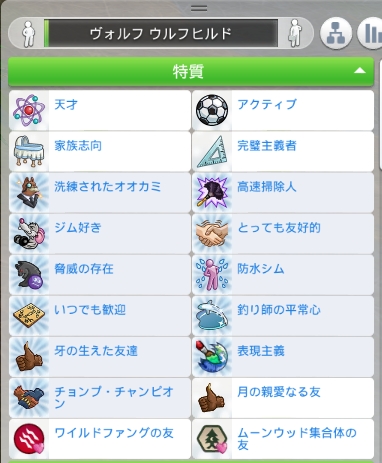 さてランドルフさんは残すは【治療シーカー】願望の「治療薬を飲む」だけなんですが、通常シムに戻ってしまっては、折角4つそろえた良気質がまたランダムガチャ状態になるので、今しばらくウェアウルフのままで居てもらいます。